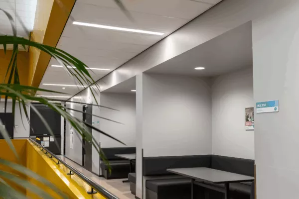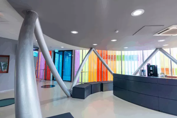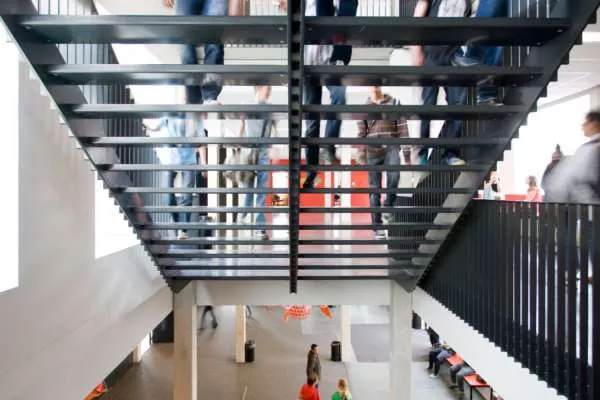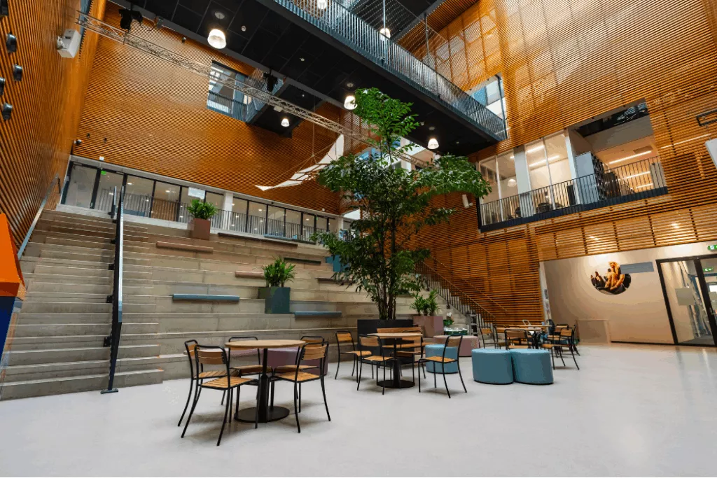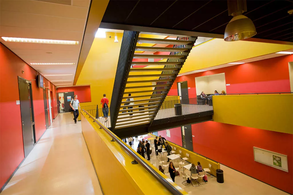 Gegroepeerd rond een binnenplaats is elk domein van de school ondergebracht in een eigen gebouw met een eigen sfeer. De toegang tot de centrale binnenplaats is een kleurrijke blikvanger en tevens het beeldmerk van de school.